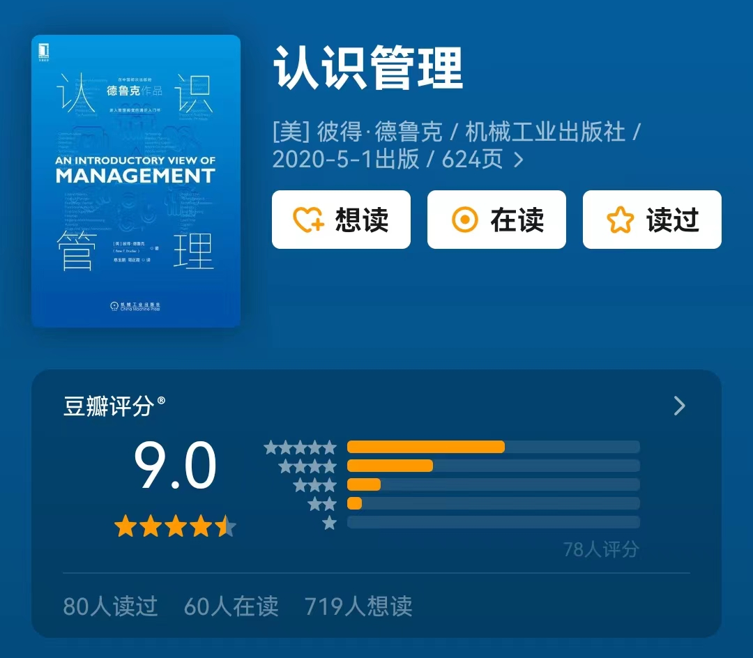 《认识管理》于1977年首次出版,是管理学奠基人彼得·德鲁克在大学教授管理用的教材,如果你看过这本书,你会发现这本事每一章最后有总结和思考题。这本书也是德鲁克著名著作《管理:使命、责任和实务》的浓缩版,基本保留了原来的框架,内容更加精炼。如同这本书的名称《认识管理》,如果你想要系统学管理,这本书就是不二选。